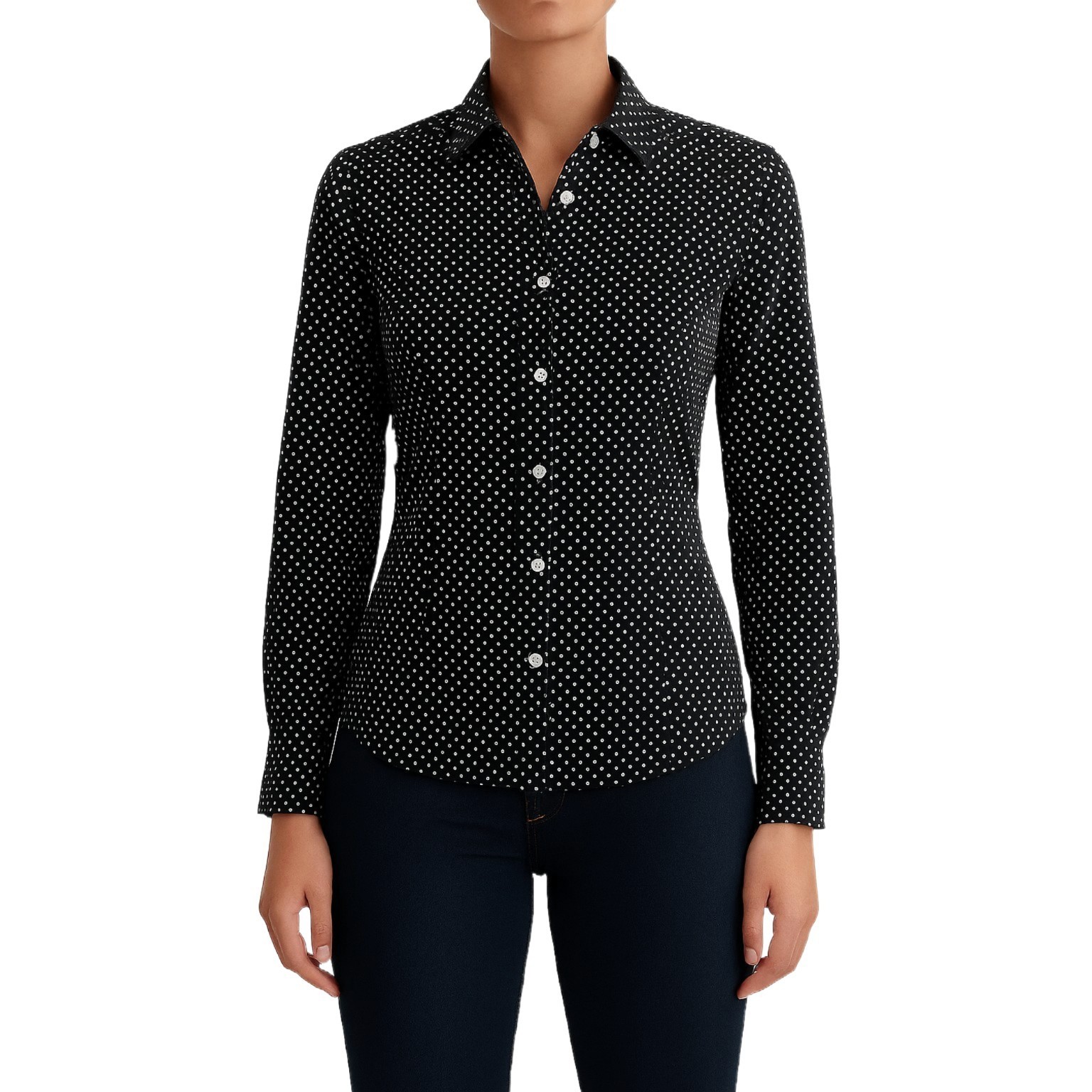 This Banana Republic women’s slim-fit button down shirt (size 4) offers timeless style with a modern fit. Crafted in a black fabric with crisp white polka dots, it’s tailored to contour the chest, waist, and arms for a flattering silhouette. The wrinkle-resistant finish helps keep it looking polished all day with minimal care, making it ideal for office wear, business casual, or weekend outings.
