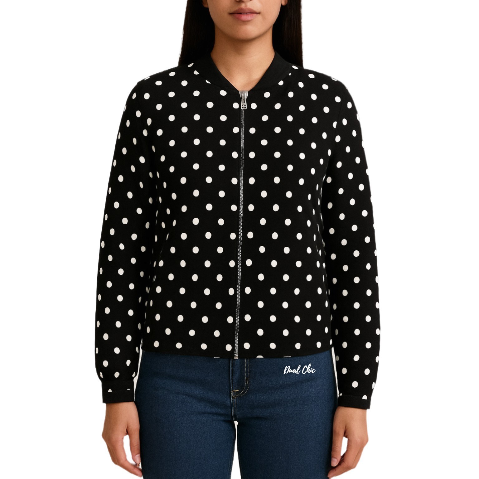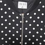 This Elle women's bomber jacket combines timeless polka dots with a classic silhouette. It features a full zip closure with a branded zipper pull, two front pockets, and a soft polyester lining for comfort and structure. The back waistband has a subtle elastic detail that provides a flattering fit.