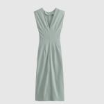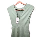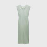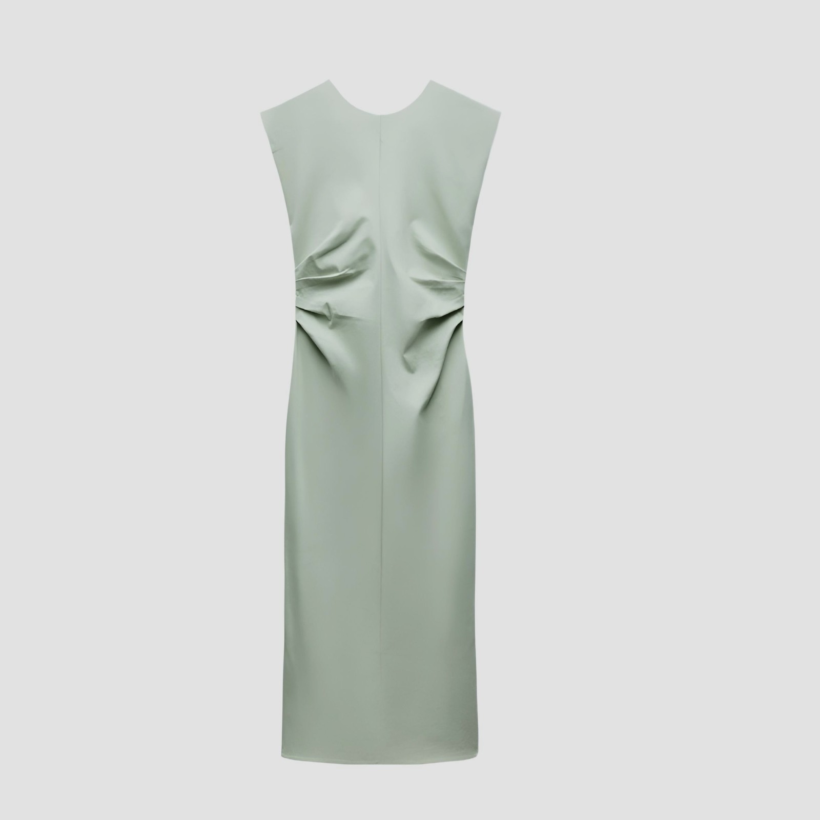 This ZARA women’s sleeveless midi dress in a soft green tone combines clean lines with a modern, flattering silhouette. Designed with a round neckline at the front and a subtle V-back, it features elegant pleated details at the waist that add texture and shape. The structured yet comfortable fabric blend provides a refined drape that works well for both casual and semi-formal occasions.