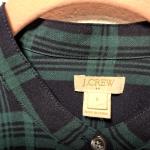 This J.Crew Factory women’s shirt combines classic plaid with a modern, feminine touch. Designed in navy and green tones, it features a round neckline, pleated front, and partial button-down closure. Long sleeves with buttoned cuffs and a rounded hem provide a comfortable and polished fit. Made from soft polyester fabric, this versatile shirt sits approximately at hip length and is machine washable.